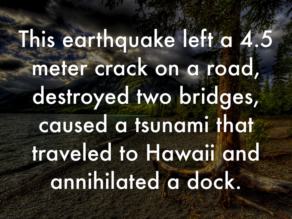 This earthquake left a 4.5 meter crack on a road, destroyed two bridges, caused a tsunami that traveled to Hawaii and annihilated a dock.