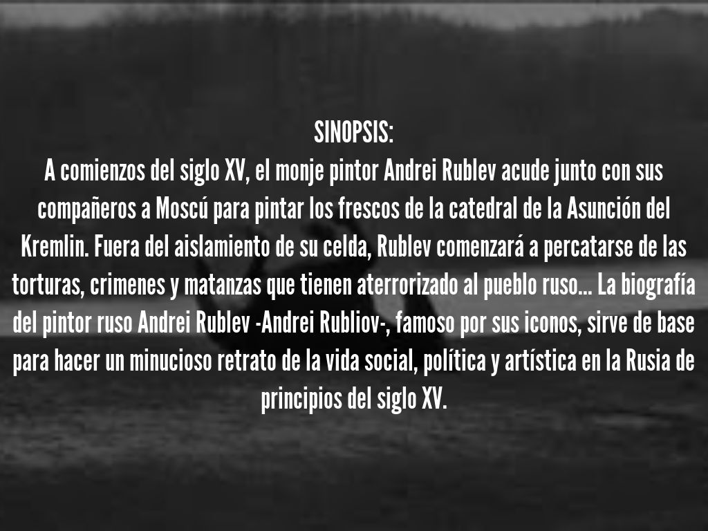 A comienzos del siglo XV, el monje pintor Andrei Rublev acude junto con sus compañeros a Moscú para pintar los frescos de la catedral de la Asunción del Kremlin. Fuera del aislamiento de su celda, Rublev comenzará a percatarse de las torturas, crimenes y matanzas que tienen aterrorizado al pueblo ruso... La biografía del pintor ruso Andrei Rublev -Andrei Rubliov-, famoso por sus iconos, sirve de base para hacer un minucioso retrato de la vida social, política y artística en la Rusia de principios del siglo XV.
