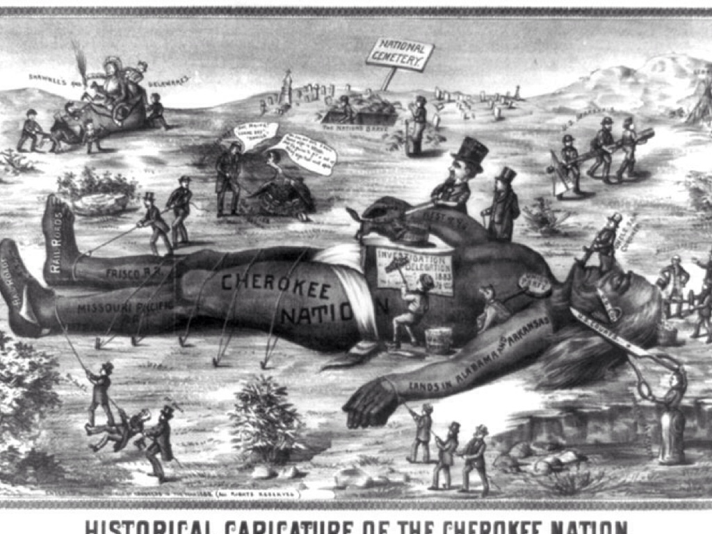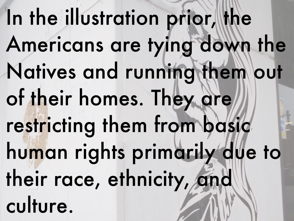 In the illustration prior, the Americans are tying down the Natives and running them out of their homes. They are restricting them from basic human rights primarily due to their race, ethnicity, and culture.