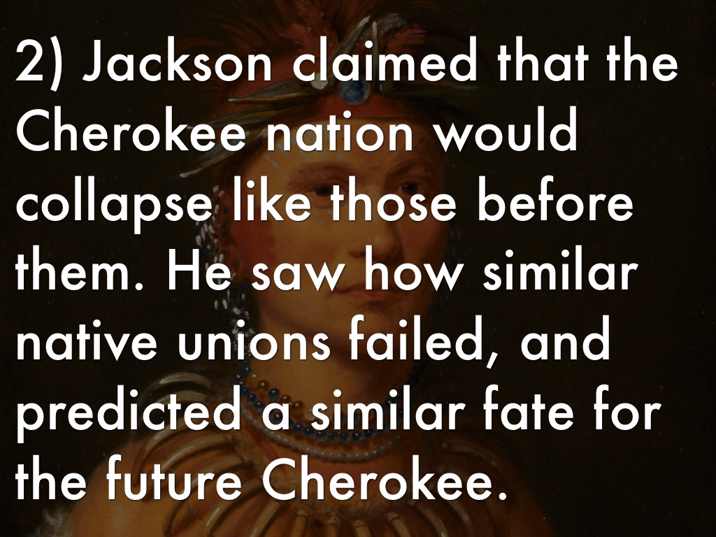 2) Jackson claimed that the Cherokee nation would collapse like those before them. He saw how similar native unions failed, and predicted a similar fate for the future Cherokee.