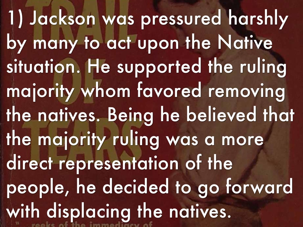 1) Jackson was pressured harshly by many to act upon the Native situation. He supported the ruling majority whom favored removing the natives. Being he believed that the majority ruling was a more direct representation of the people, he decided to go forward with displacing the natives.