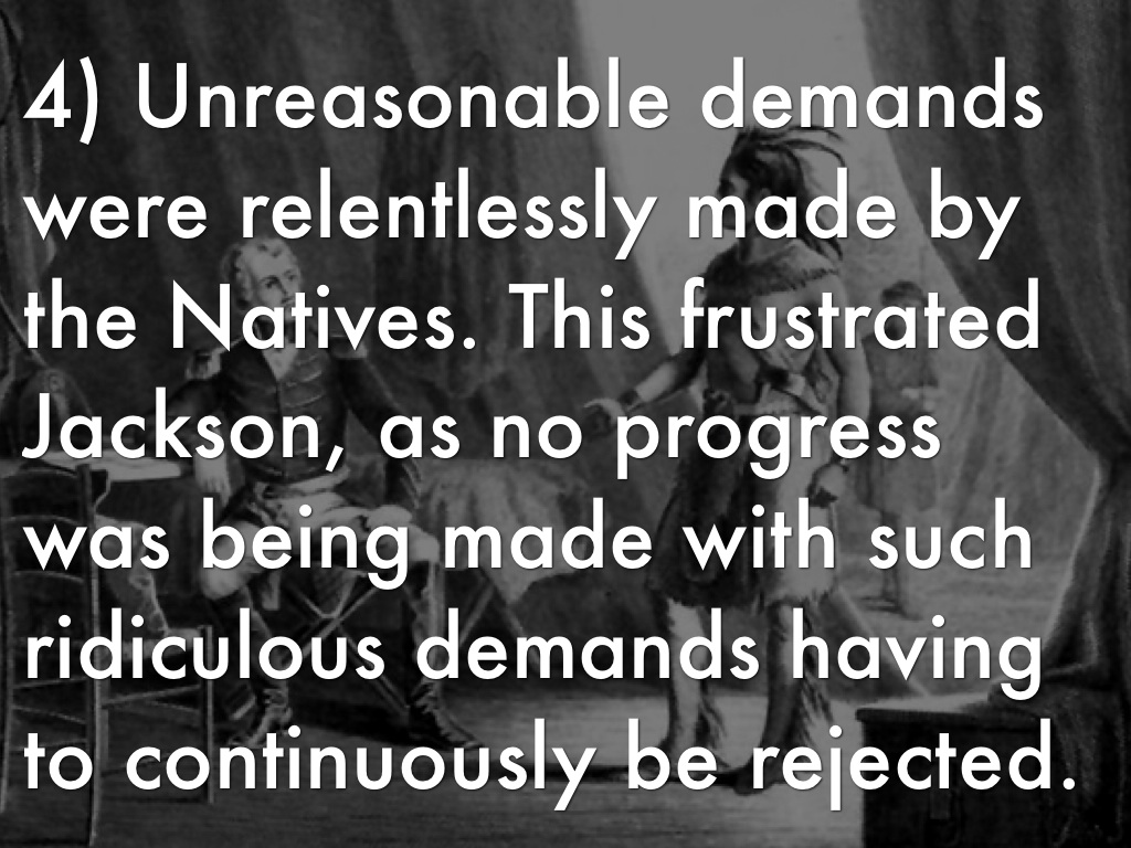 4) Unreasonable demands were relentlessly made by the Natives. This frustrated Jackson, as no progress was being made with such ridiculous demands having to continuously be rejected.