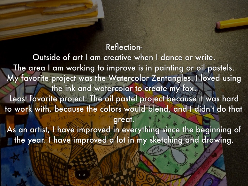 As an artist, I have improved in everything since the beginning of the year. I have improved a lot in my sketching and drawing.