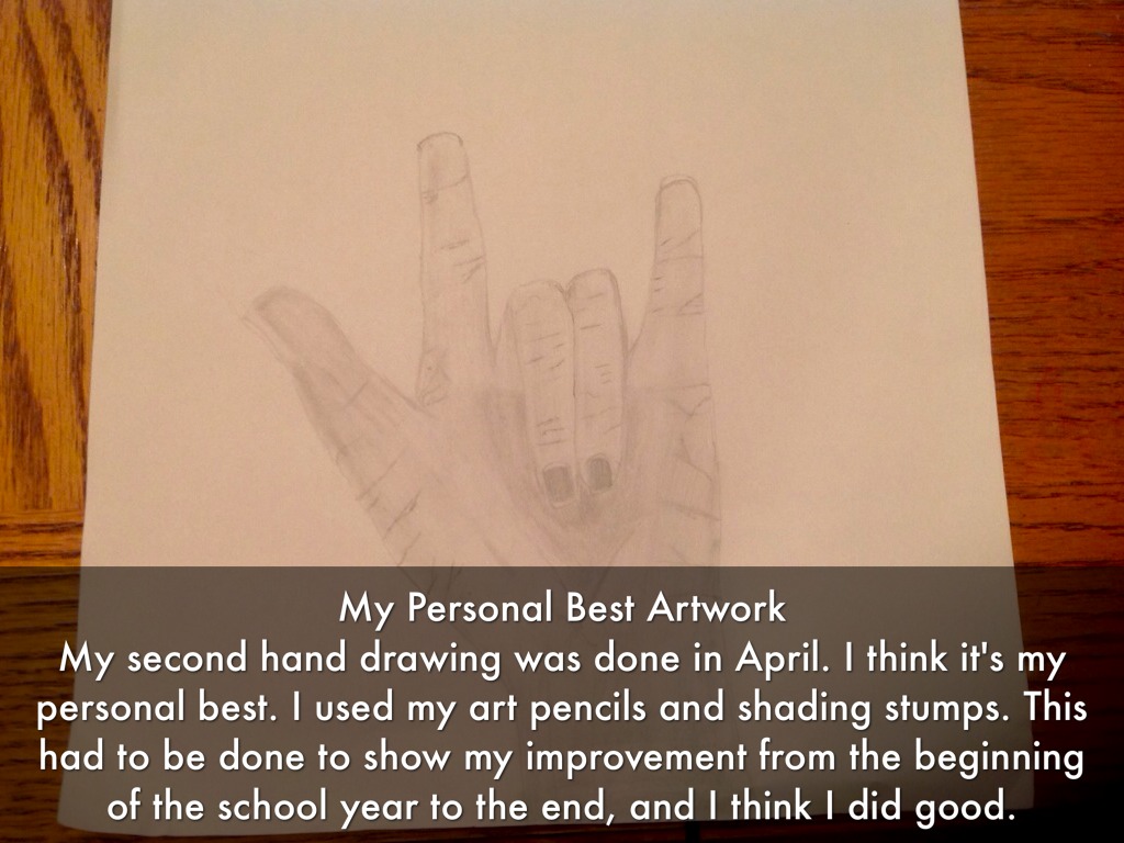 My second hand drawing was done in April. I think it's my personal best. I used my art pencils and shading stumps. This had to be done to show my improvement from the beginning of the school year to the end, and I think I did good.