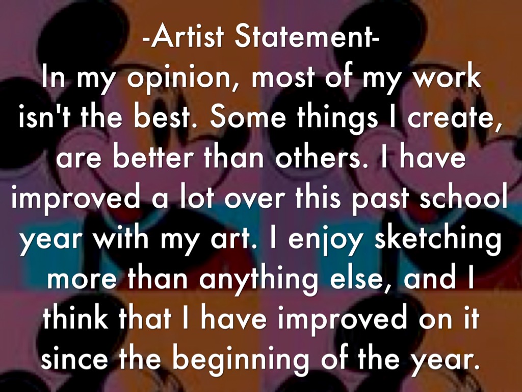 In my opinion, most of my work isn't the best. Some things I create, are better than others. I have improved a lot over this past school year with my art. I enjoy sketching more than anything else, and I think that I have improved on it since the beginning of the year.