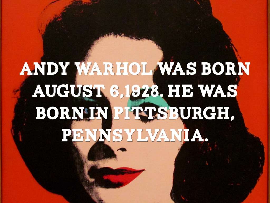 Andy Warhol was born August 6,1928. He was born in Pittsburgh, Pennsylvania.