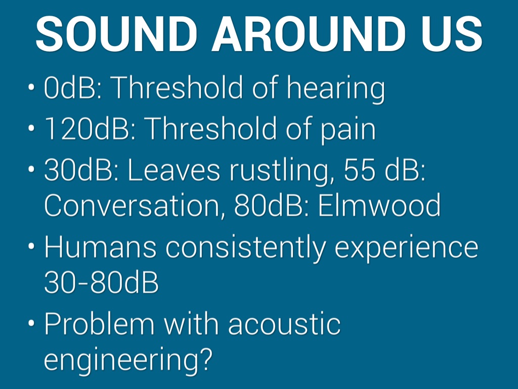 • 30dB: Leaves rustling, 55 dB: Conversation, 80dB: Elmwood