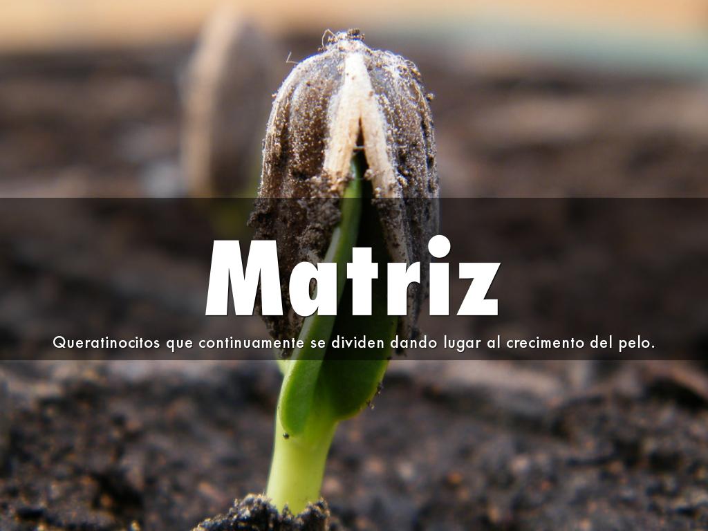 Matriz: Está formada por queratinocitos jóvenes que continuamente se dividen empujando a los que encuentran en las capas superiores dando lugar al crecimiento del pelo.