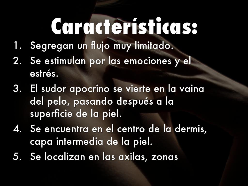 • El sudor apocrino se vierte en la vaina del pelo, pasando después a la superficie de la piel.