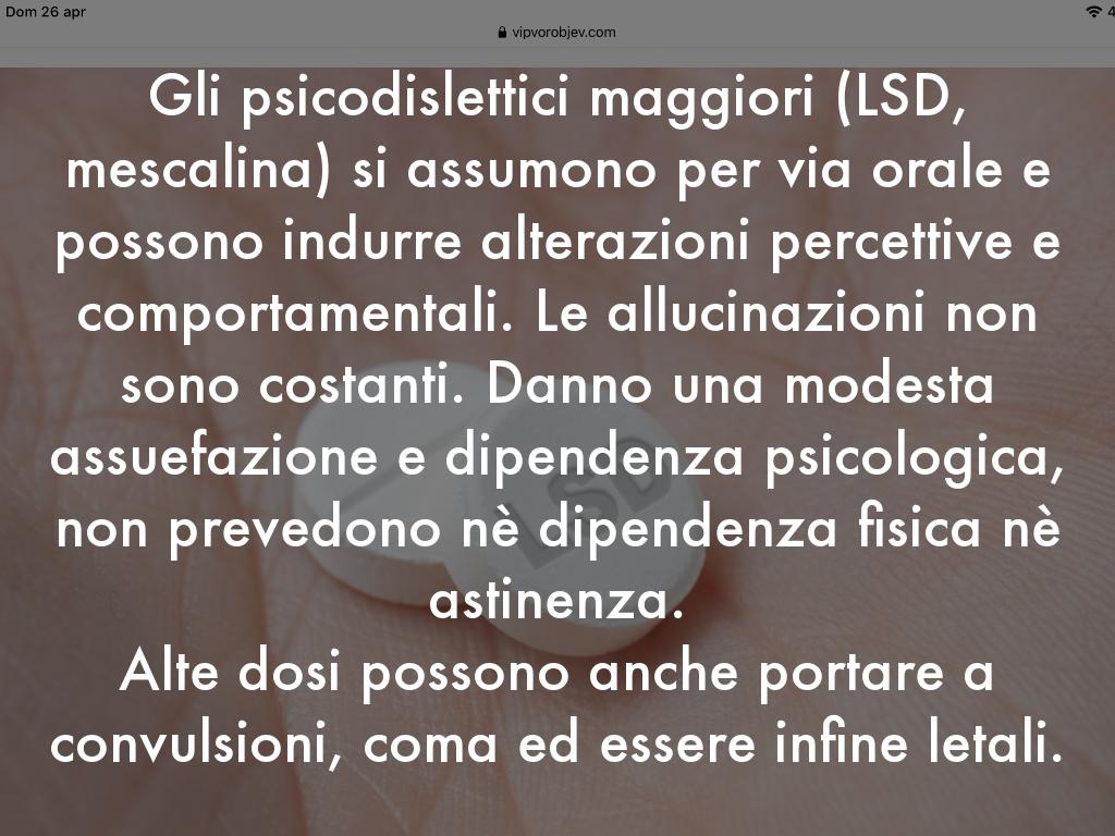 Gli psicodislettici maggiori (LSD, mescalina) si assumono per via orale e possono indurre alterazioni percettive e comportamentali. Le allucinazioni non sono costanti. Danno una modesta assuefazione e dipendenza psicologica, non prevedono nè dipendenza fisica nè astinenza.