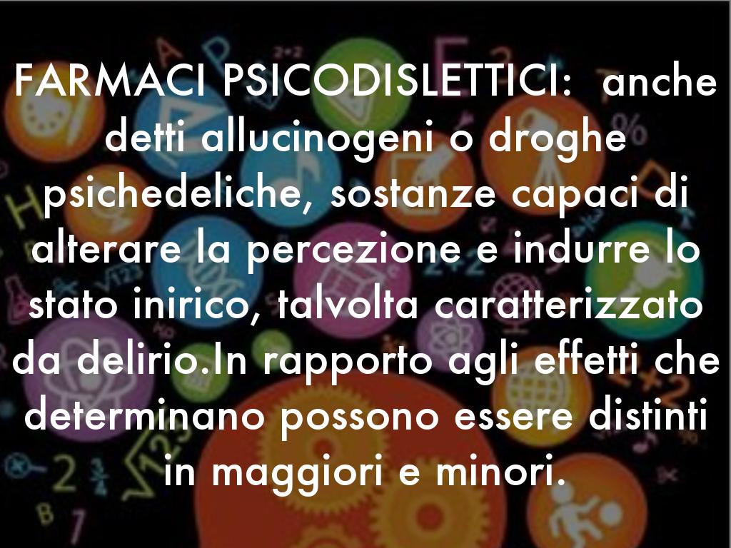 FARMACI PSICODISLETTICI: anche detti allucinogeni o droghe psichedeliche, sostanze capaci di alterare la percezione e indurre lo stato inirico, talvolta caratterizzato da delirio.In rapporto agli effetti che determinano possono essere distinti in maggiori e minori.