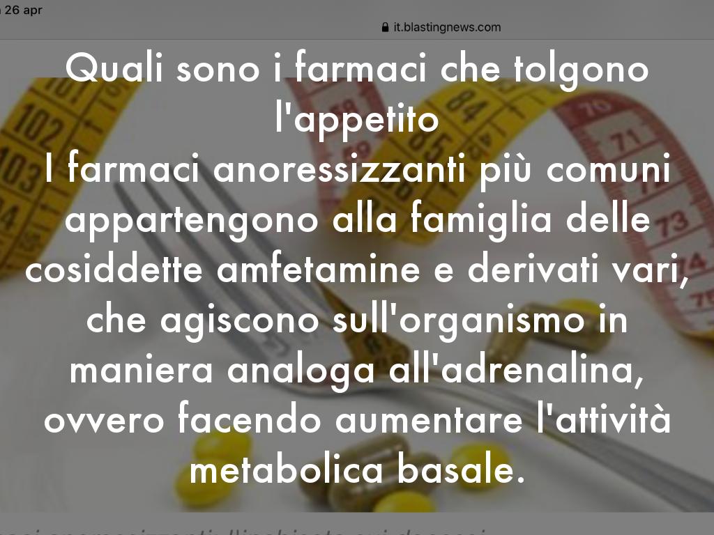 I farmaci anoressizzanti più comuni appartengono alla famiglia delle cosiddette amfetamine e derivati vari, che agiscono sull'organismo in maniera analoga all'adrenalina, ovvero facendo aumentare l'attività metabolica basale.