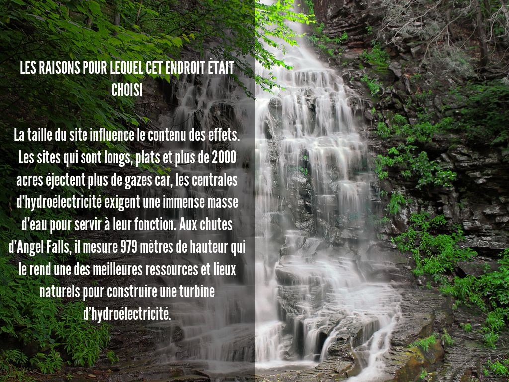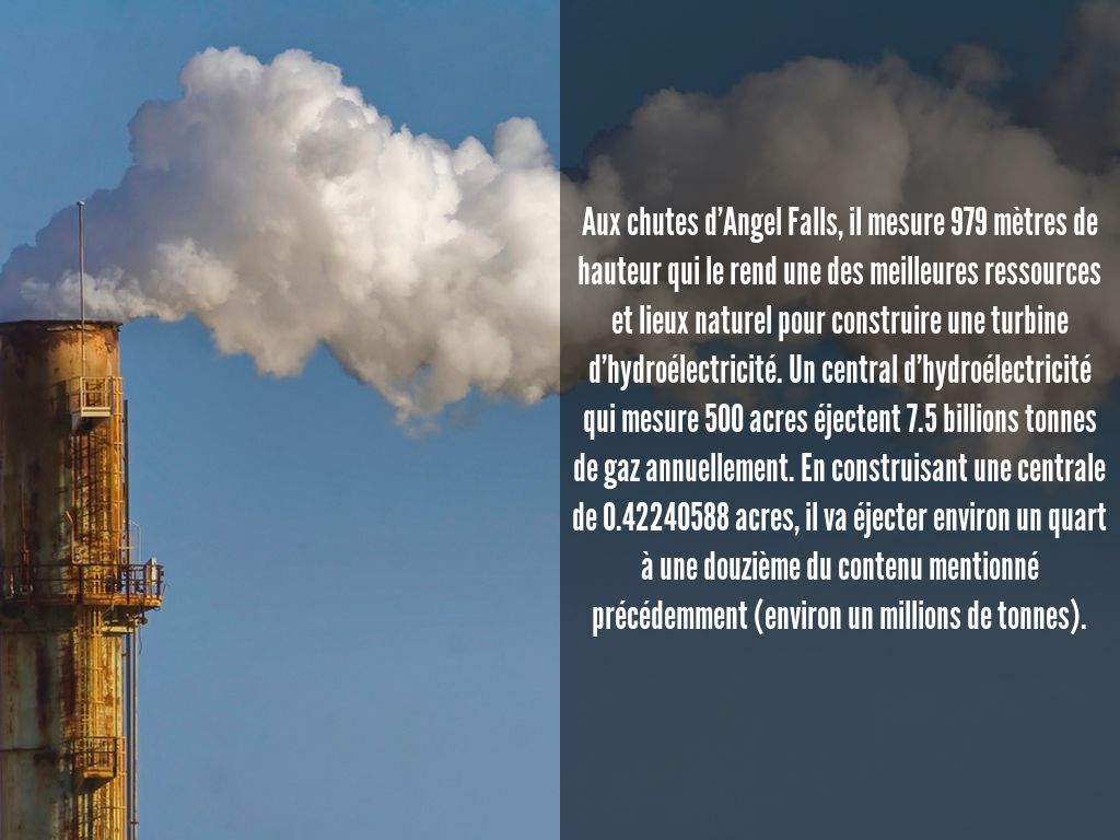 Aux chutes d'Angel Falls, il mesure 979 mètres de hauteur qui le rend une des meilleures ressources et lieux naturel pour construire une turbine d'hydroélectricité. Un central d'hydroélectricité qui mesure 500 acres éjectent 7.5 billions tonnes de gaz annuellement. En construisant une centrale de 0.42240588 acres, il va éjecter environ un quart à une douzième du contenu mentionné précédemment (environ un millions de tonnes).