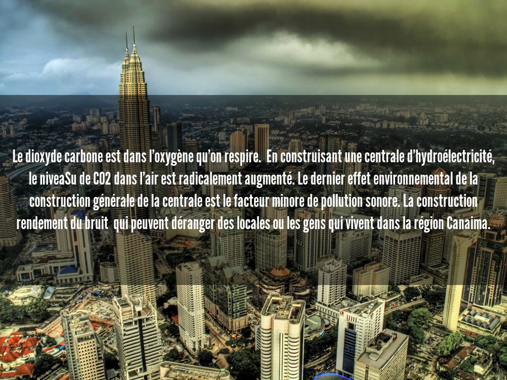 Le dioxyde carbone est dans l'oxygène qu'on respire. En construisant une centrale d'hydroélectricité, le niveaSu de CO2 dans l'air est radicalement augmenté. Le dernier effet environnemental de la construction générale de la centrale est le facteur minore de pollution sonore. La construction rendement du bruit qui peuvent déranger des locales ou les gens qui vivent dans la région Canaima.