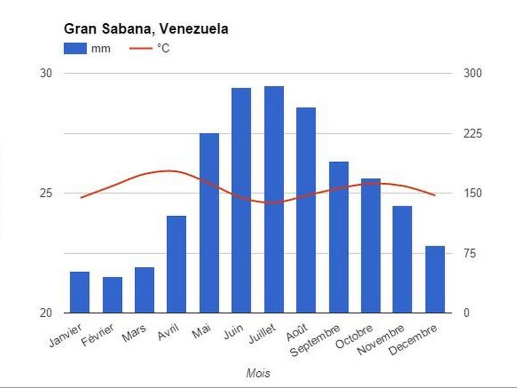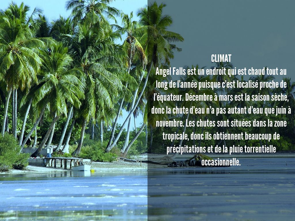Angel Falls est un endroit qui est chaud tout au long de l’année puisque c’est localisé proche de l’équateur. Décembre à mars est la saison sèche, donc la chute d’eau n'a pas autant d'eau que juin à novembre. Les chutes sont situées dans la zone tropicale, donc ils obtiennent beaucoup de précipitations et de la pluie torrentielle occasionnelle.