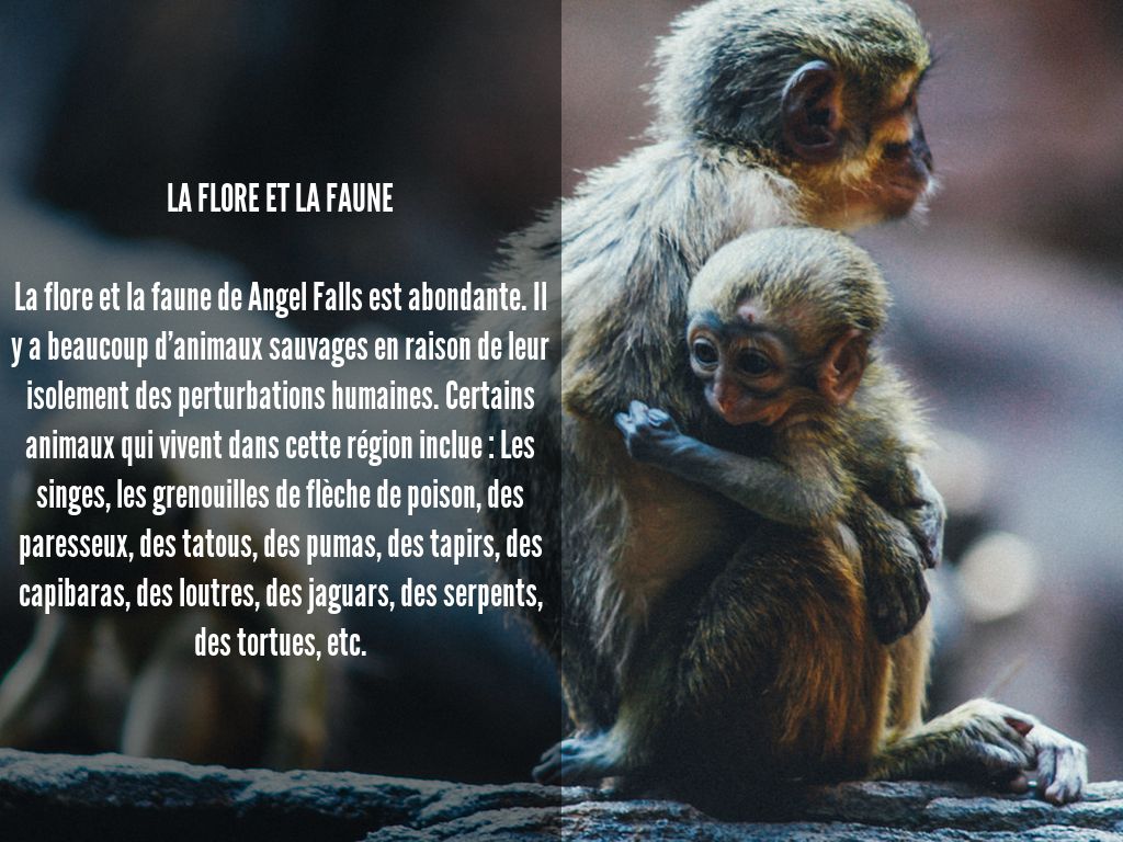 La flore et la faune de Angel Falls est abondante. Il y a beaucoup d'animaux sauvages en raison de leur isolement des perturbations humaines. Certains animaux qui vivent dans cette région inclue : Les singes, les grenouilles de flèche de poison, des paresseux, des tatous, des pumas, des tapirs, des capibaras, des loutres, des jaguars, des serpents, des tortues, etc.