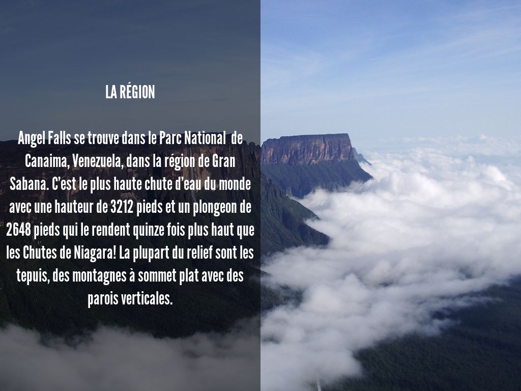 Angel Falls se trouve dans le Parc National de Canaima, Venezuela, dans la région de Gran Sabana. C’est le plus haute chute d’eau du monde avec une hauteur de 3212 pieds et un plongeon de 2648 pieds qui le rendent quinze fois plus haut que les Chutes de Niagara! La plupart du relief sont les tepuis, des montagnes à sommet plat avec des parois verticales.