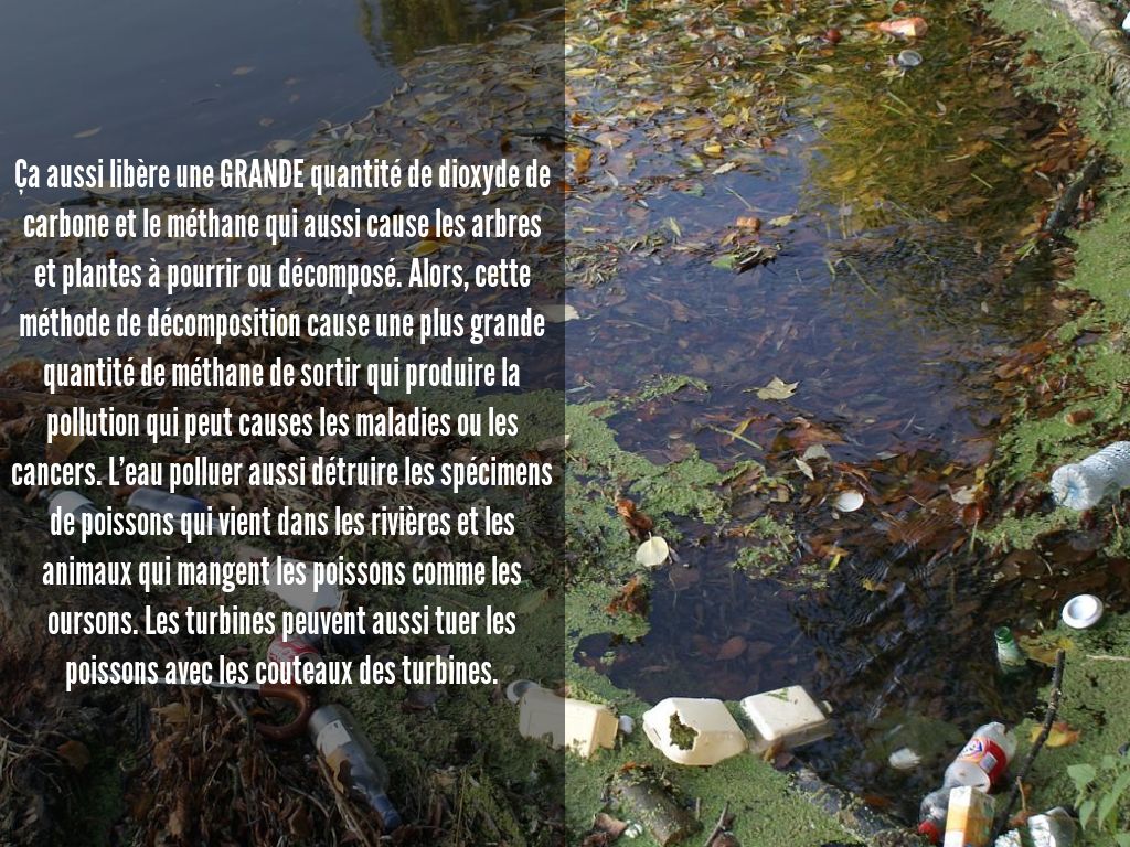 Ça aussi libère une GRANDE quantité de dioxyde de carbone et le méthane qui aussi cause les arbres et plantes à pourrir ou décomposé. Alors, cette méthode de décomposition cause une plus grande quantité de méthane de sortir qui produire la pollution qui peut causes les maladies ou les cancers. L’eau polluer aussi détruire les spécimens de poissons qui vient dans les rivières et les animaux qui mangent les poissons comme les oursons. Les turbines peuvent aussi tuer les poissons avec les couteaux des turbines.