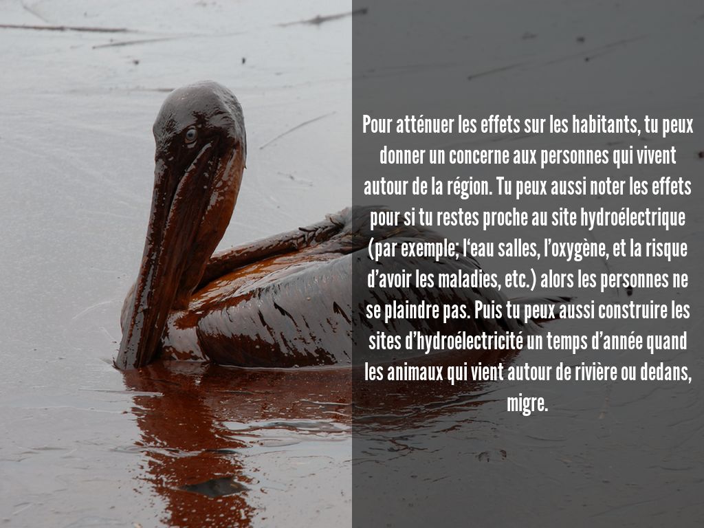 Pour atténuer les effets sur les habitants, tu peux donner un concerne aux personnes qui vivent autour de la région. Tu peux aussi noter les effets pour si tu restes proche au site hydroélectrique (par exemple; l‘eau salles, l’oxygène, et la risque d’avoir les maladies, etc.) alors les personnes ne se plaindre pas. Puis tu peux aussi construire les sites d’hydroélectricité un temps d’année quand les animaux qui vient autour de rivière ou dedans, migre.