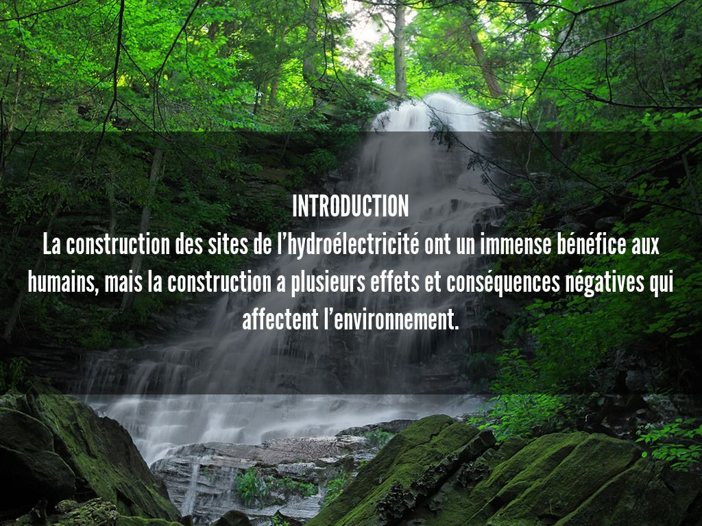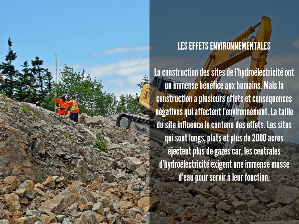 La construction des sites de l’hydroélectricité ont un immense bénéfice aux humains, mais la construction a plusieurs effets et conséquences négatives qui affectent l’environnement.