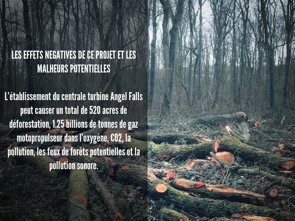 L’établissement du centrale turbine Angel Falls peut causer un total de 520 acres de déforestation, 1.25 billions de tonnes de gaz motopropulseur dans l’oxygène, CO2, la pollution, les feux de forêts potentielles et la pollution sonore.