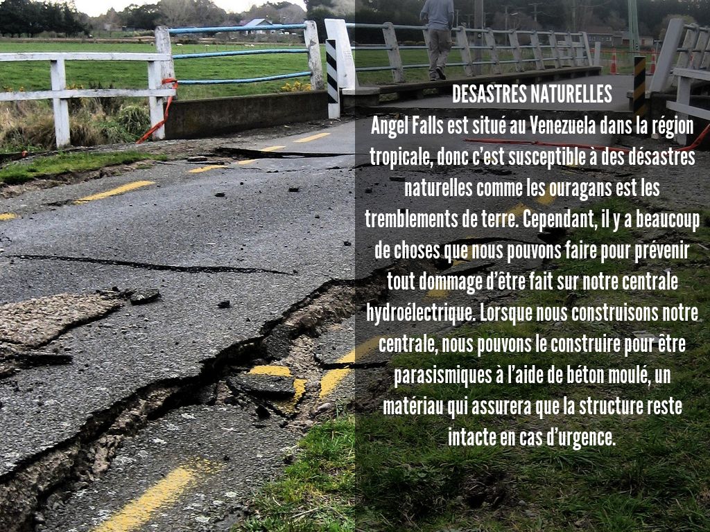 Angel Falls est situé au Venezuela dans la région tropicale, donc c’est susceptible à des désastres naturelles comme les ouragans est les tremblements de terre. Cependant, il y a beaucoup de choses que nous pouvons faire pour prévenir tout dommage d'être fait sur notre centrale hydroélectrique. Lorsque nous construisons notre centrale, nous pouvons le construire pour être parasismiques à l'aide de béton moulé, un matériau qui assurera que la structure reste intacte en cas d'urgence.