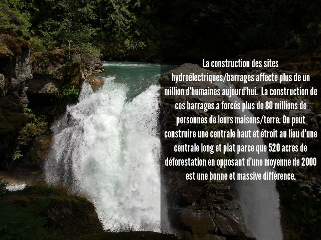 La construction des sites hydroélectriques/barrages affecte plus de un million d’humaines aujourd’hui. La construction de ces barrages a forcés plus de 80 millions de personnes de leurs maisons/terre. On peut construire une centrale haut et étroit au lieu d’une centrale long et plat parce que 520 acres de déforestation en opposant d'une moyenne de 2000 est une bonne et massive différence.