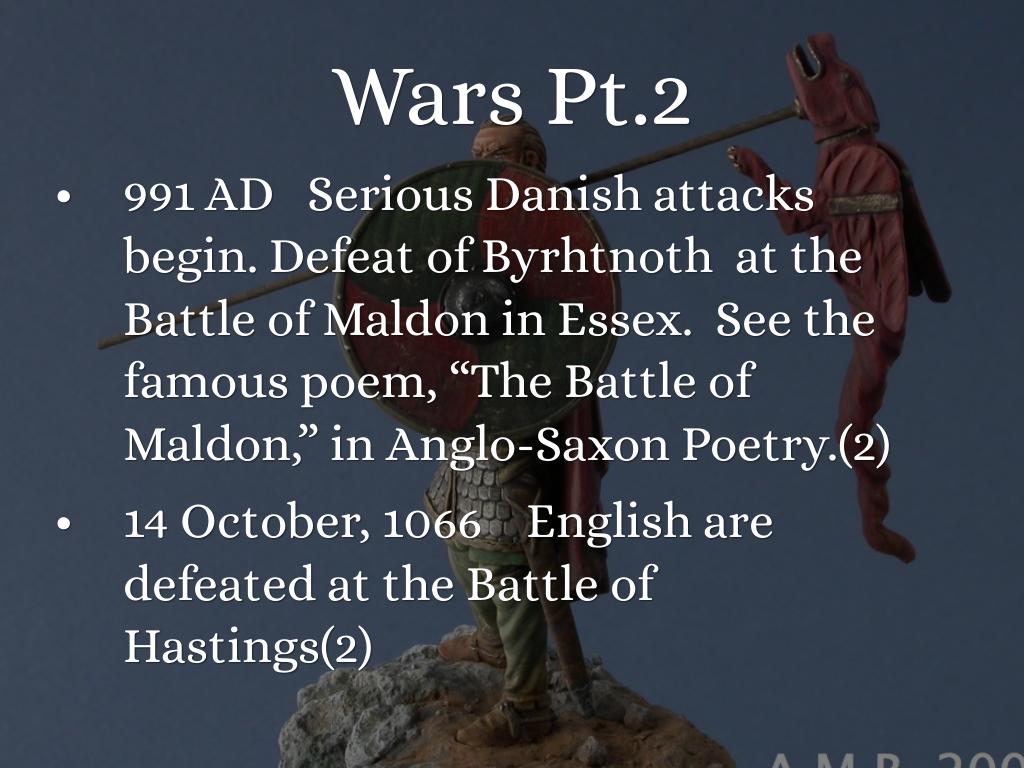 991 AD Serious Danish attacks begin. Defeat of Byrhtnoth at the Battle of Maldon in Essex. See the famous poem, “The Battle of Maldon,” in Anglo-Saxon Poetry.(2)