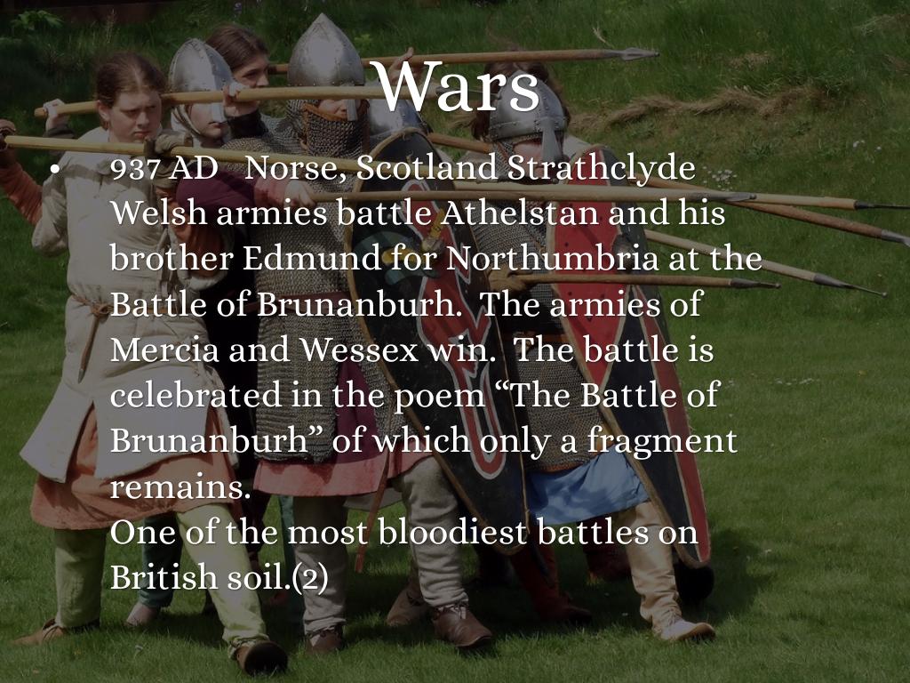 937 AD Norse, Scotland Strathclyde Welsh armies battle Athelstan and his brother Edmund for Northumbria at the Battle of Brunanburh. The armies of Mercia and Wessex win. The battle is celebrated in the poem “The Battle of Brunanburh” of which only a fragment remains.