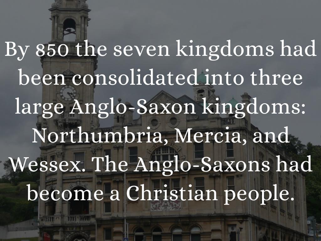 By 850 the seven kingdoms had been consolidated into three large Anglo-Saxon kingdoms: Northumbria, Mercia, and Wessex. The Anglo-Saxons had become a Christian people.