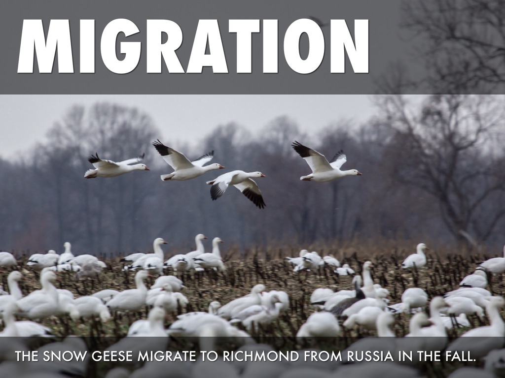 THE SNOW GEESE MIGRATE TO RICHMOND FROM RUSSIA IN THE FALL.