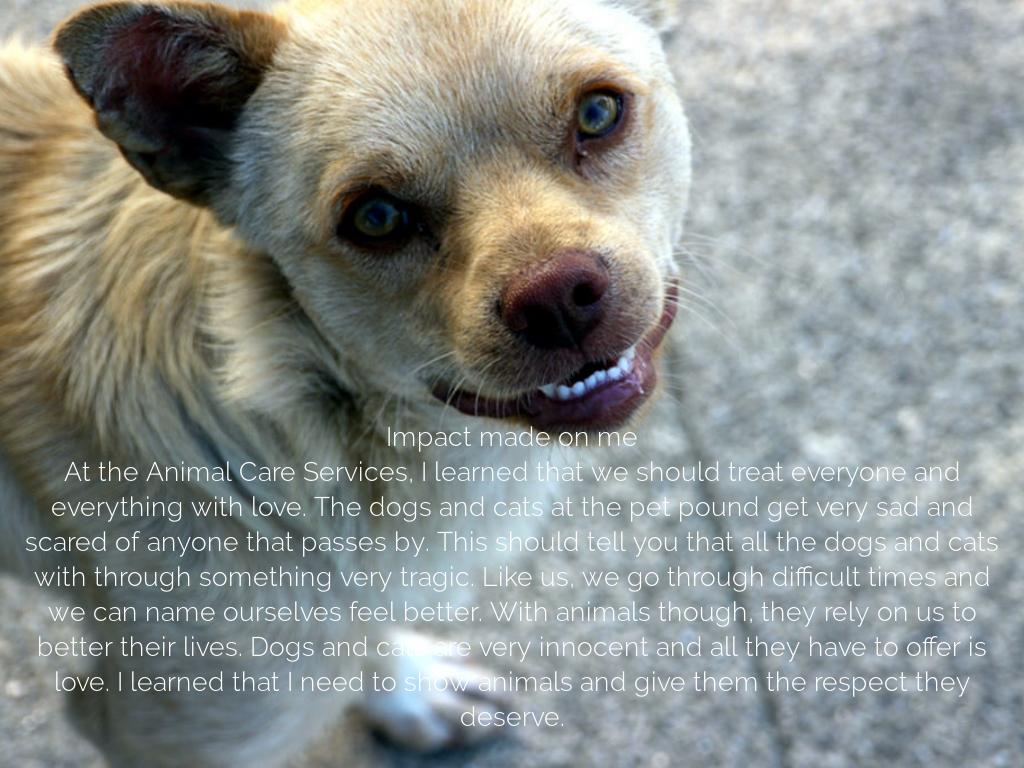 Impact made on me At the Animal Care Services, I learned that we should treat everyone and everything with love. The dogs and cats at the pet pound get very sad and scared of anyone that passes by. This should tell you that all the dogs and cats with through something very tragic. Like us, we go through difficult times and we can name ourselves feel better. With animals though, they rely on us to better their lives. Dogs and cats are very innocent and all they have to offer is love. I learned that I need to show animals and give them the respect they deserve.