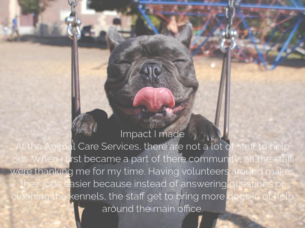 Impact I made At the Animal Care Services, there are not a lot of staff to help out. When I first became a part of there community, all the staff were thanking me for my time. Having volunteers around makes their jobs easier because instead of answering questions or cleaning the kennels, the staff get to bring more dogs in or help around the main office.
