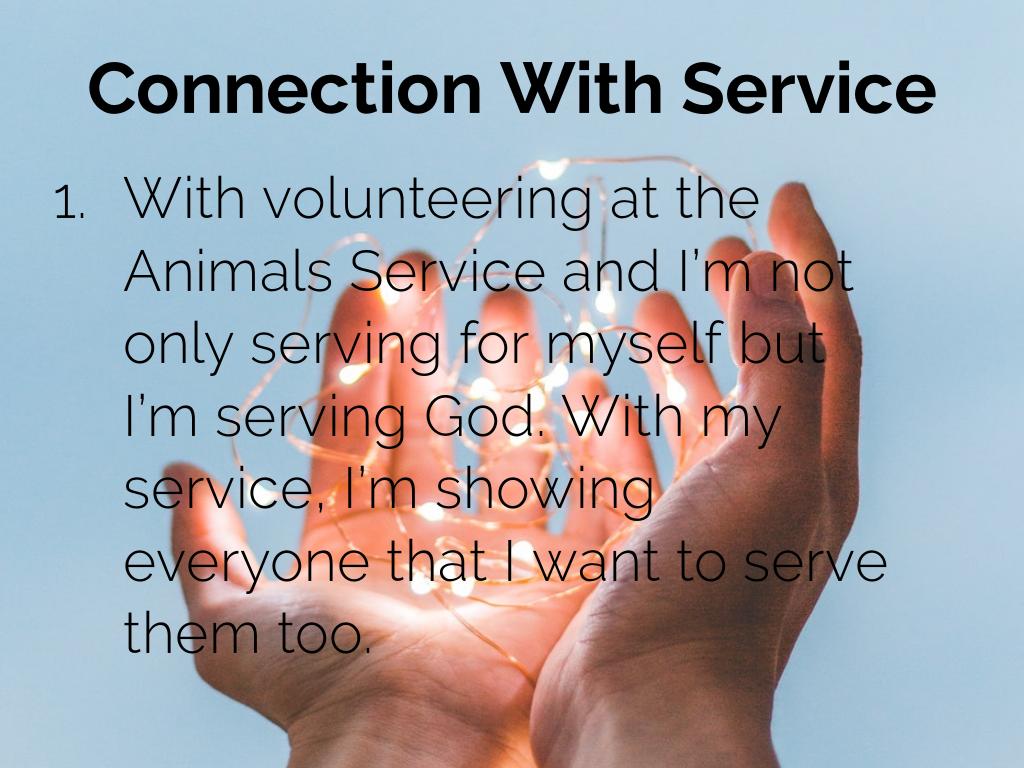 With volunteering at the Animals Service and I’m not only serving for myself but I’m serving God. With my service, I’m showing everyone that I want to serve them too.