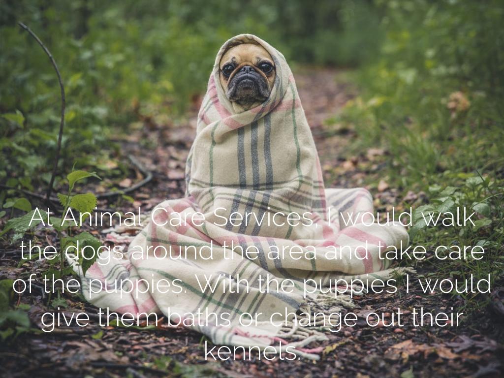 At Animal Care Services, I would walk the dogs around the area and take care of the puppies. With the puppies I would give them baths or change out their kennels.