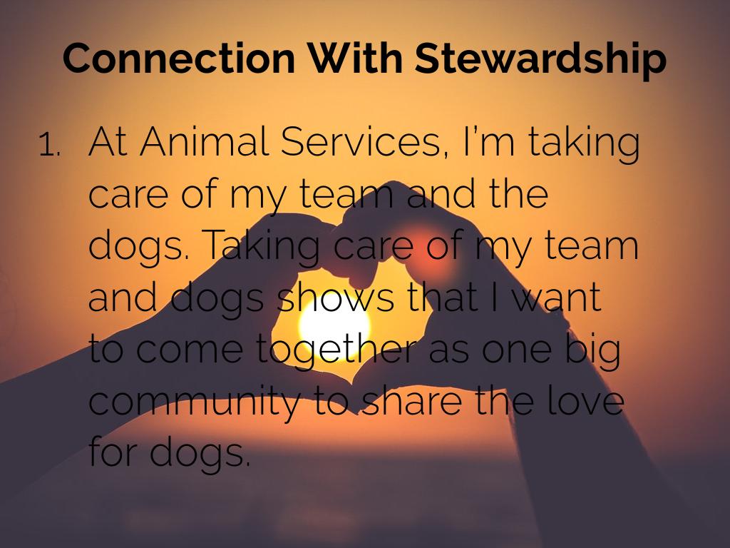 At Animal Services, I’m taking care of my team and the dogs. Taking care of my team and dogs shows that I want to come together as one big community to share the love for dogs.