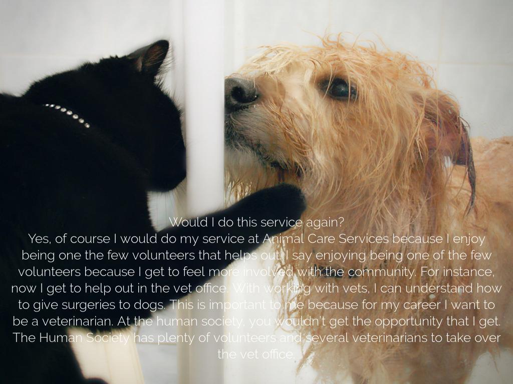 Would I do this service again? Yes, of course I would do my service at Animal Care Services because I enjoy being one the few volunteers that helps out. I say enjoying being one of the few volunteers because I get to feel more involved with the community. For instance, now I get to help out in the vet office. With working with vets, I can understand how to give surgeries to dogs. This is important to me because for my career I want to be a veterinarian. At the human society, you wouldn’t get the opportunity that I get. The Human Society has plenty of volunteers and several veterinarians to take over the vet office.
