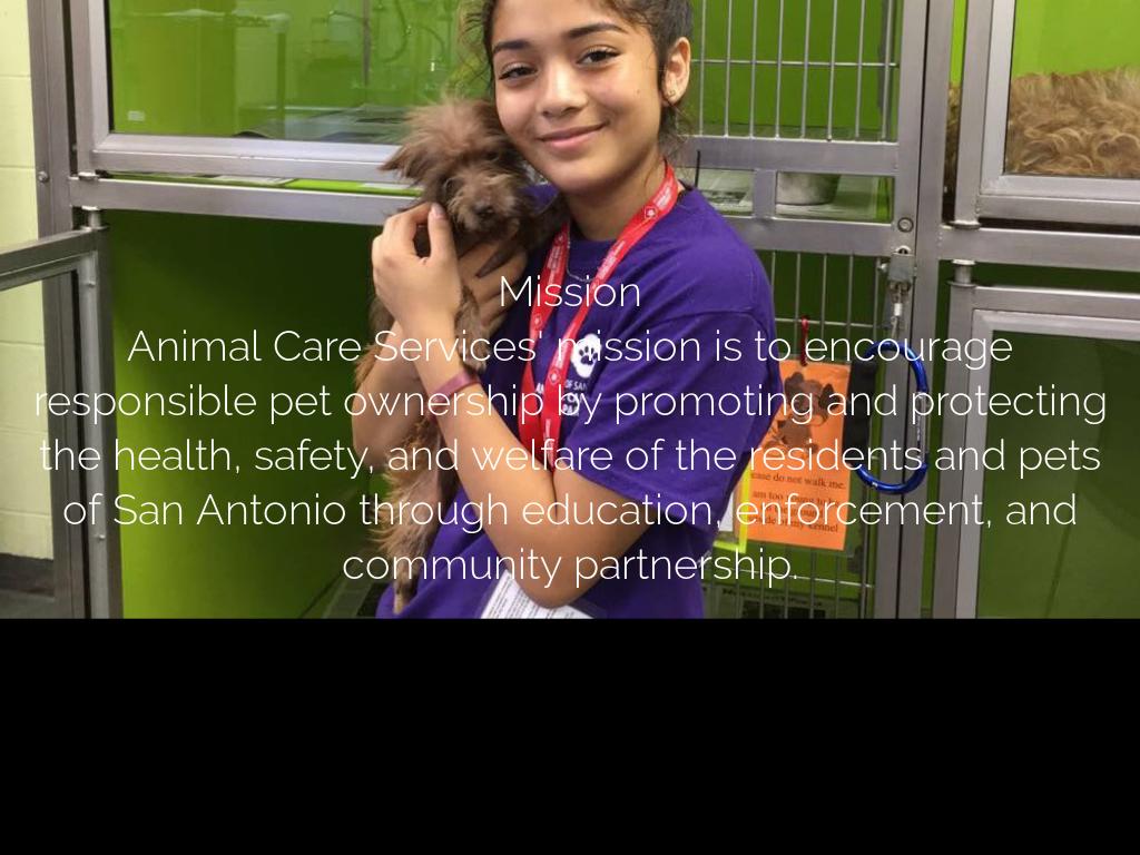 Mission Animal Care Services' mission is to encourage responsible pet ownership by promoting and protecting the health, safety, and welfare of the residents and pets of San Antonio through education, enforcement, and community partnership.
