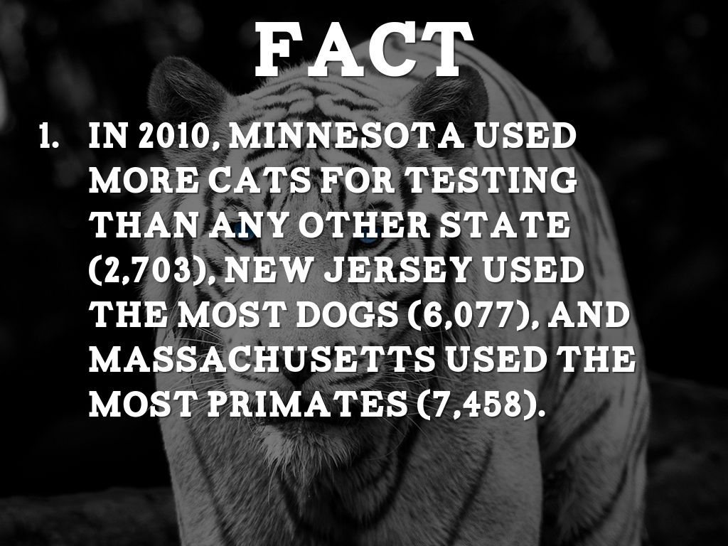 In 2010, Minnesota used more cats for testing than any other state (2,703), New Jersey used the most dogs (6,077), and Massachusetts used the most primates (7,458).