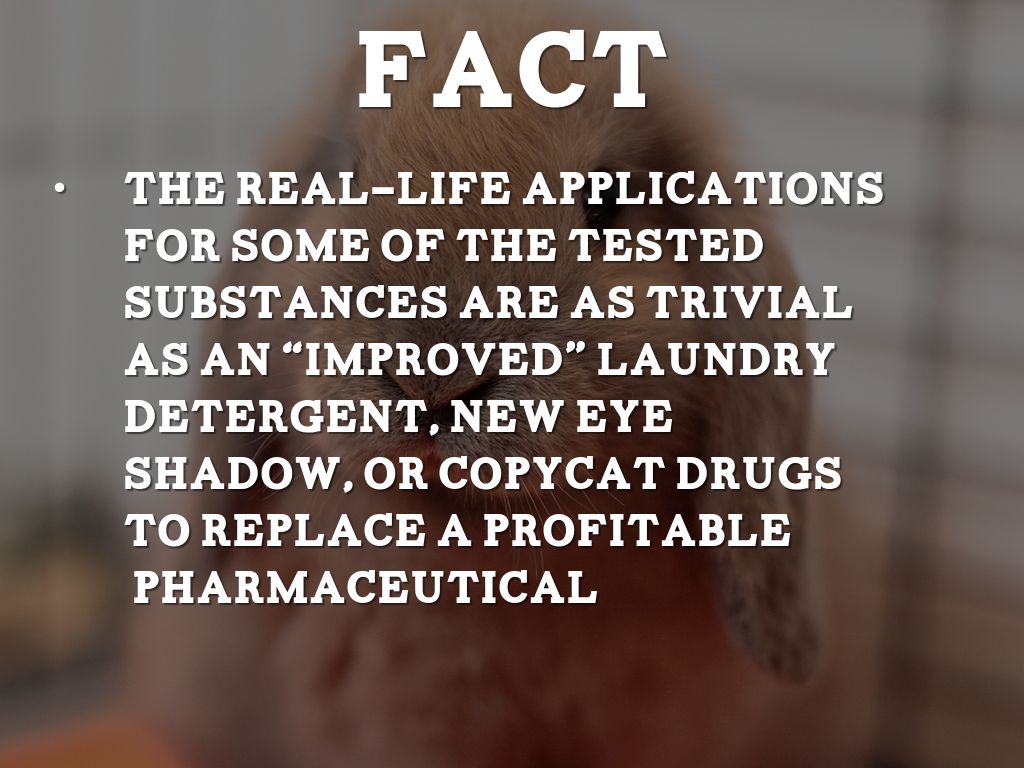The real-life applications for some of the tested substances are as trivial as an “improved” laundry detergent, new eye shadow, or copycat drugs to replace a profitable pharmaceutical