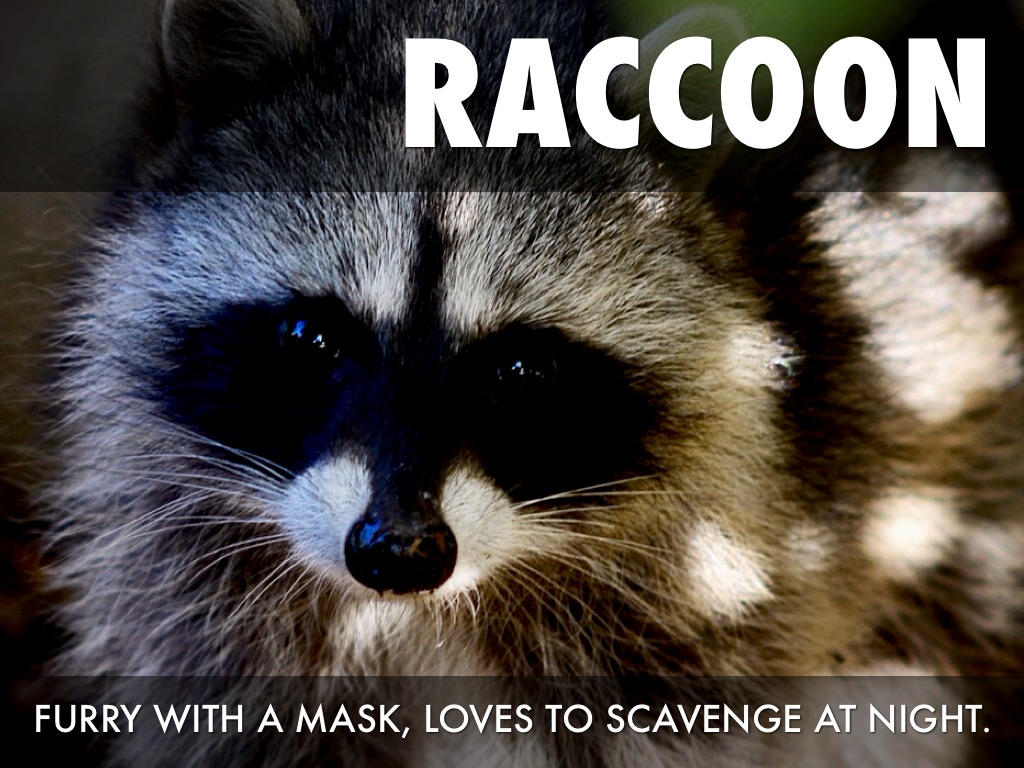 FURRY WITH A MASK, LOVES TO SCAVENGE AT NIGHT.