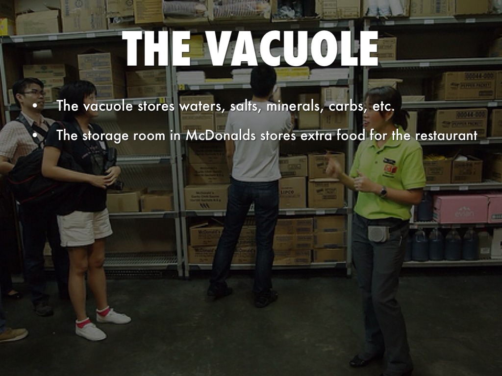 The vacuole stores waters, salts, minerals, carbs, etc.