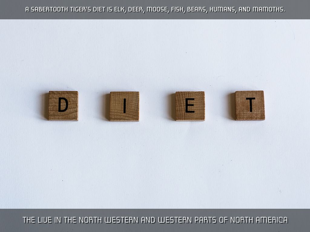 A SABERTOOTH TIGER'S DIET IS ELK, DEER, MOOSE, FISH, BEARS, HUMANS, AND MAMOTHS.