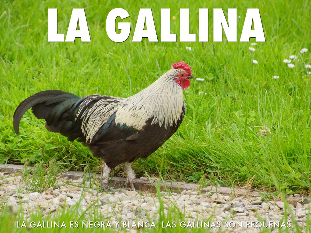 LA GALLINA ES NEGRA Y BLANCA. LAS GALLINAS SON PEQUENAS.