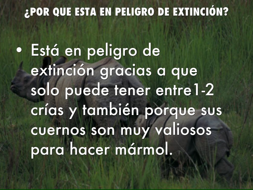 - Está en peligro de extinción gracias a que solo puede tener entre1-2 crías y también porque sus cuernos son muy valiosos para hacer mármol.