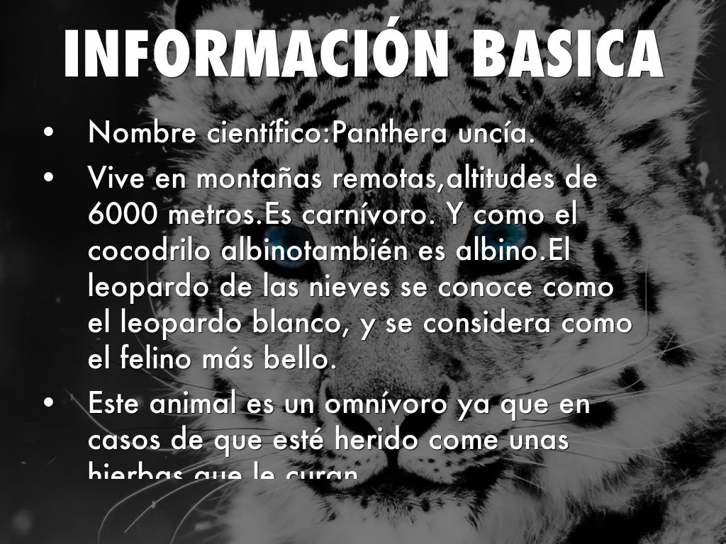 - Vive en montañas remotas,altitudes de 6000 metros.Es carnívoro. Y como el cocodrilo albinotambién es albino.El leopardo de las nieves se conoce como el leopardo blanco, y se considera como el felino más bello.
