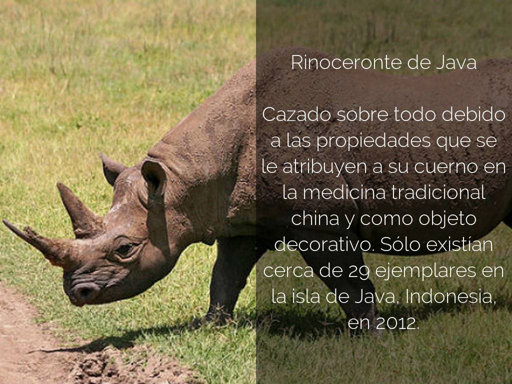 Cazado sobre todo debido a las propiedades que se le atribuyen a su cuerno en la medicina tradicional china y como objeto decorativo. Sólo existían cerca de 29 ejemplares en la isla de Java, Indonesia, en 2012.