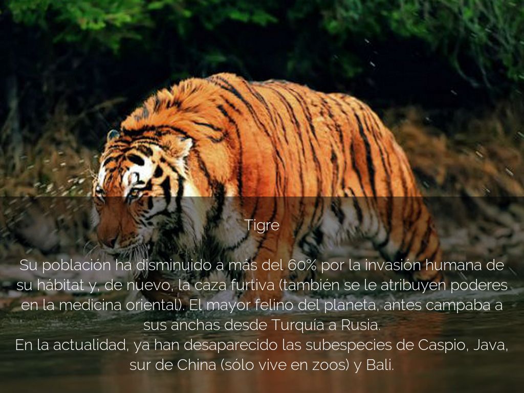 Su población ha disminuido a más del 60% por la invasión humana de su hábitat y, de nuevo, la caza furtiva (también se le atribuyen poderes en la medicina oriental). El mayor felino del planeta, antes campaba a sus anchas desde Turquía a Rusia.