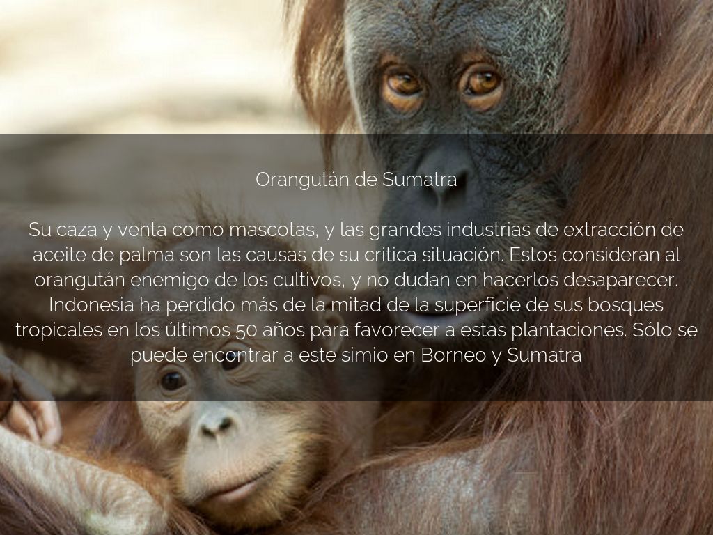 Su caza y venta como mascotas, y las grandes industrias de extracción de aceite de palma son las causas de su crítica situación. Estos consideran al orangután enemigo de los cultivos, y no dudan en hacerlos desaparecer. Indonesia ha perdido más de la mitad de la superficie de sus bosques tropicales en los últimos 50 años para favorecer a estas plantaciones. Sólo se puede encontrar a este simio en Borneo y Sumatra