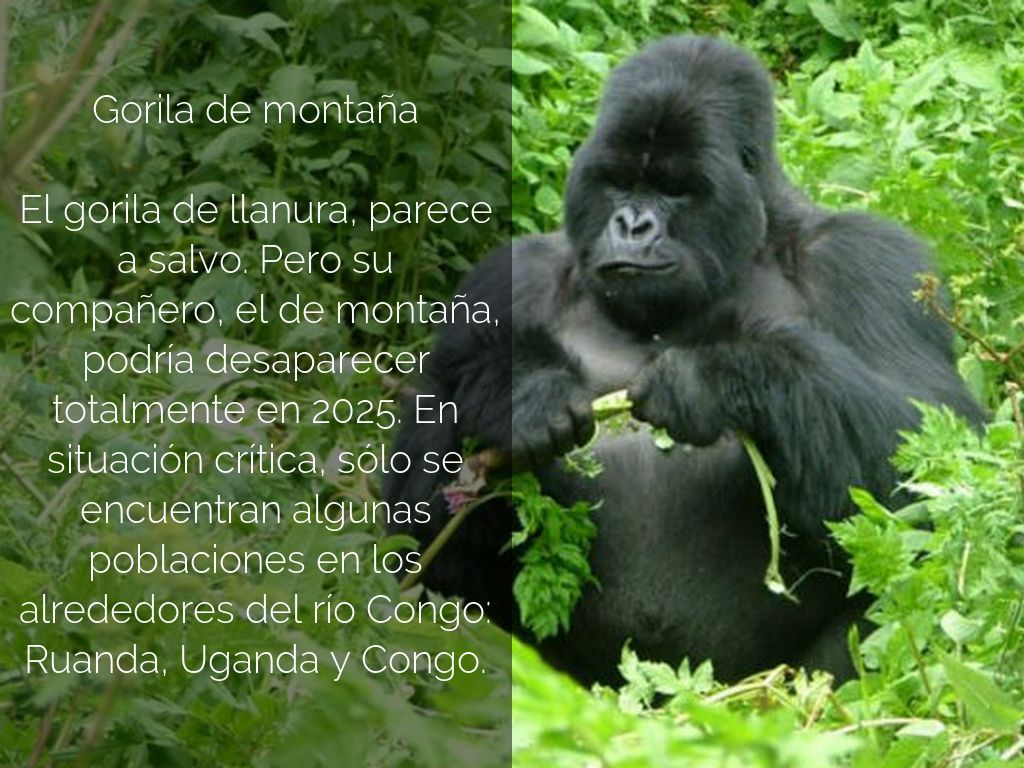 El gorila de llanura, parece a salvo. Pero su compañero, el de montaña, podría desaparecer totalmente en 2025. En situación crítica, sólo se encuentran algunas poblaciones en los alrededores del río Congo: Ruanda, Uganda y Congo.